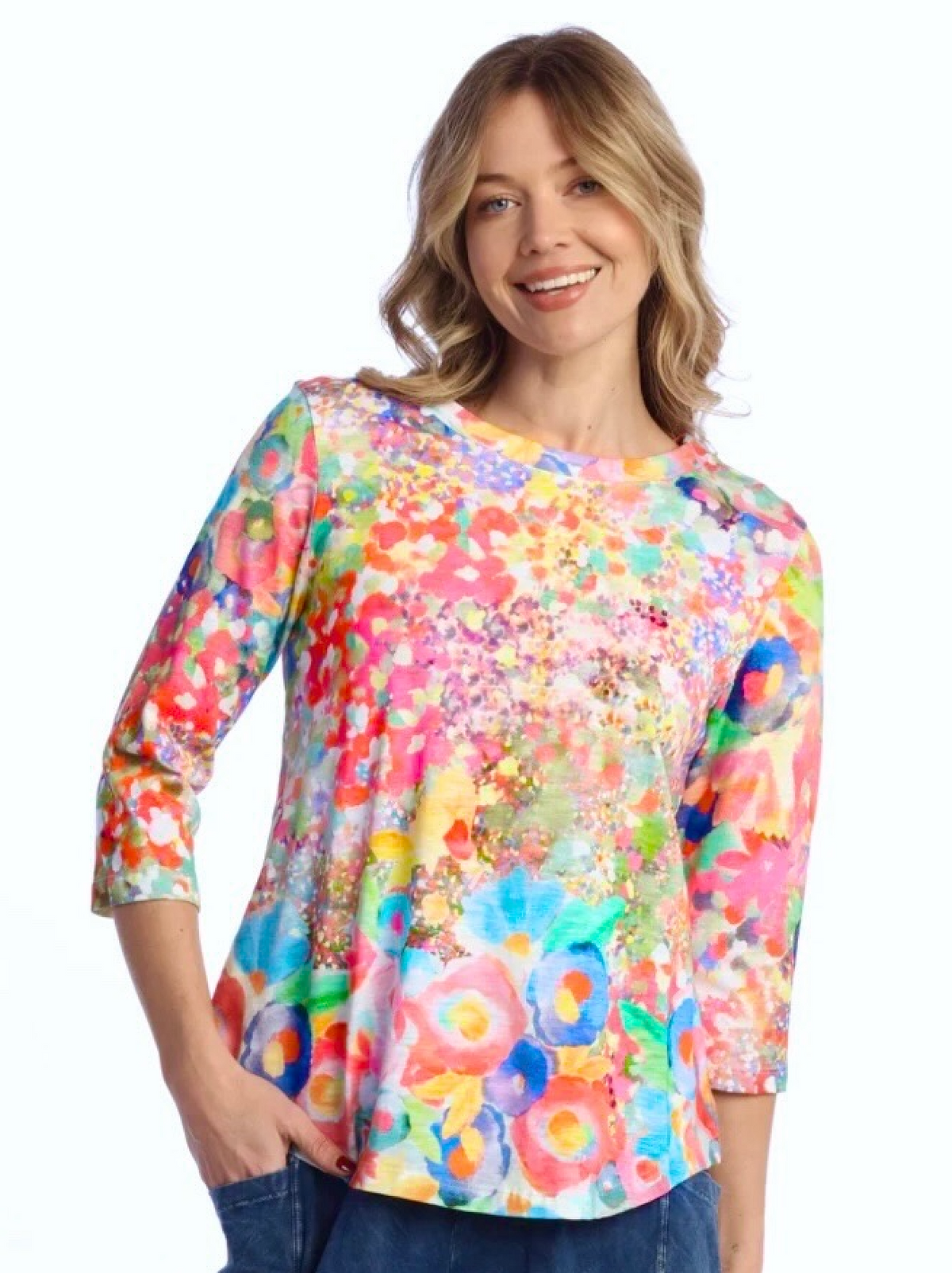 Jess & Jane Womens 3/4 Sleeve Curved Hem Meadows Top